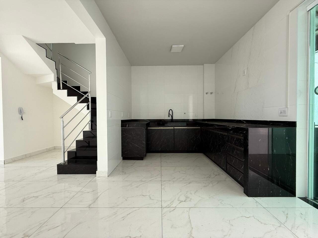 Cozinha funcional, com armários planejados sob a pia