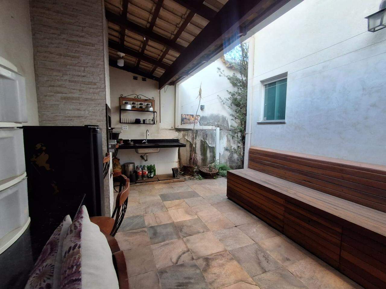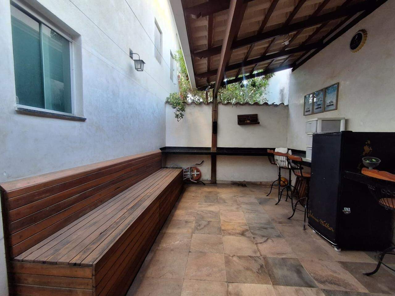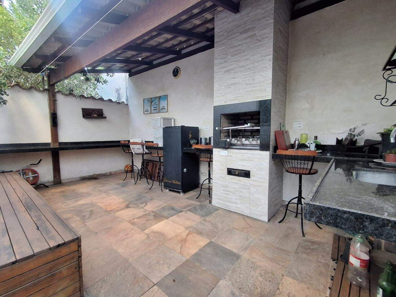 Área externa conta com espaço gourmet montado com bancada em granito, lindo espaço com grande banco em madeira de lei.