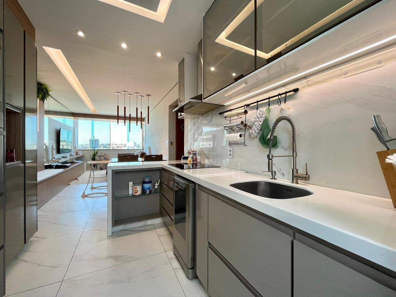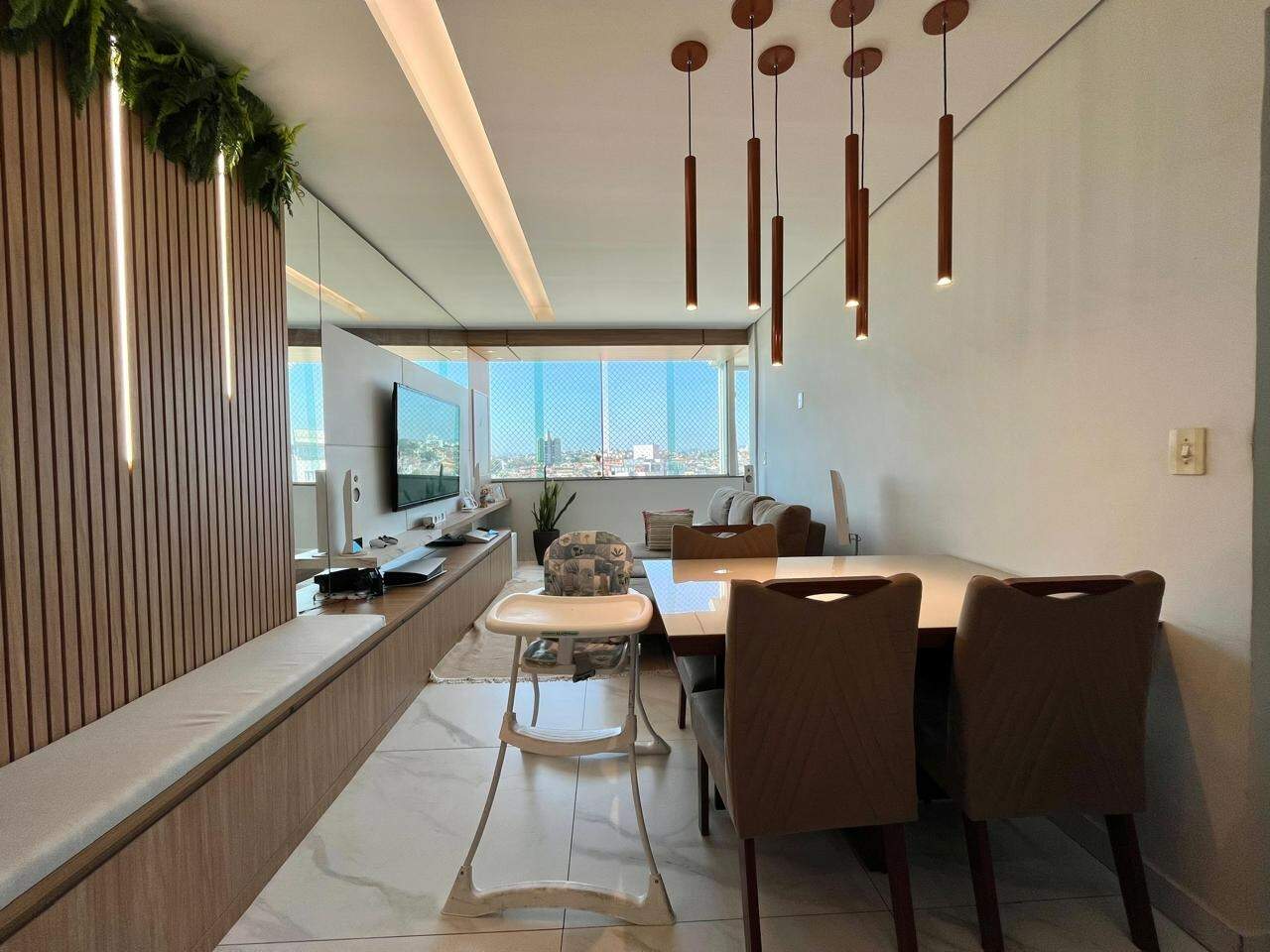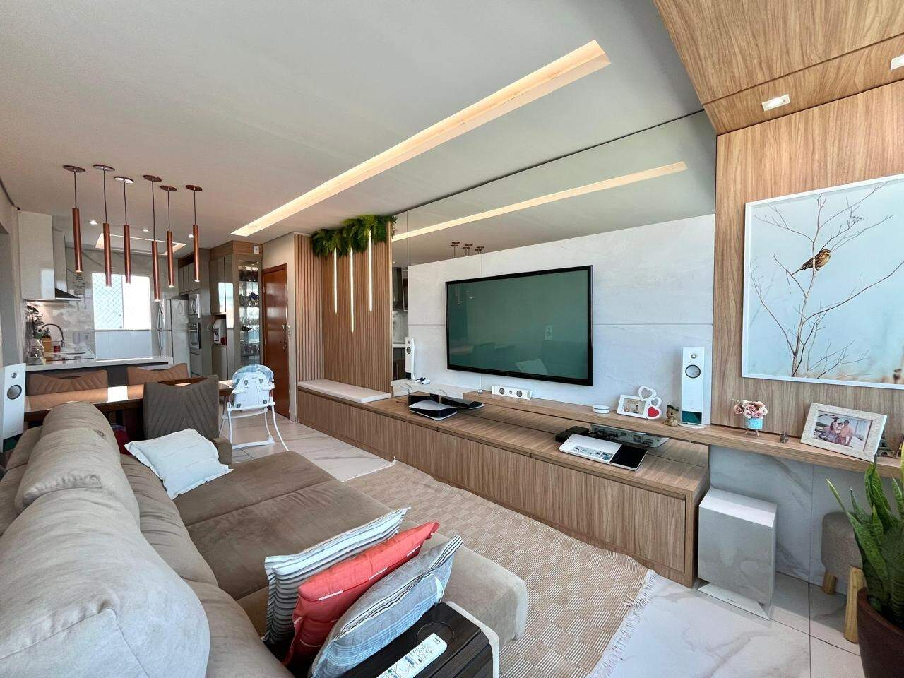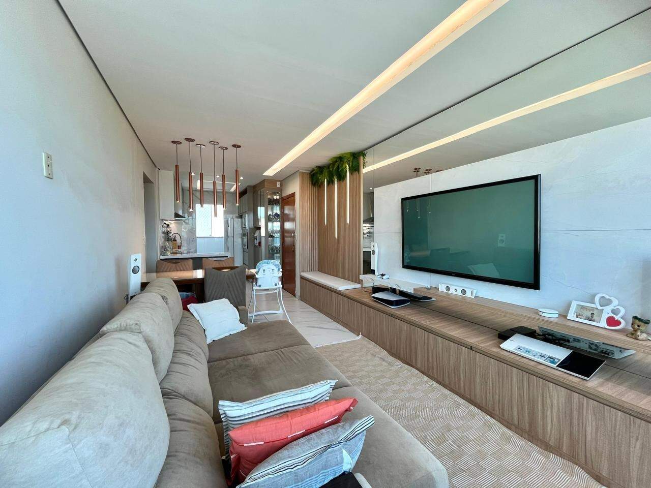 - Ampla sala integrada com a cozinha americana, rebaixamento do teto em gesso e porcelanato ;
