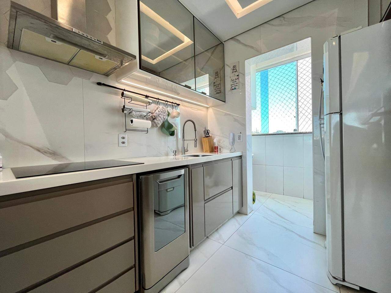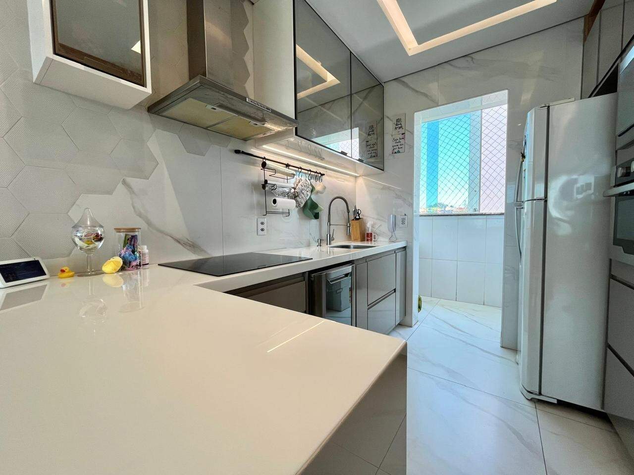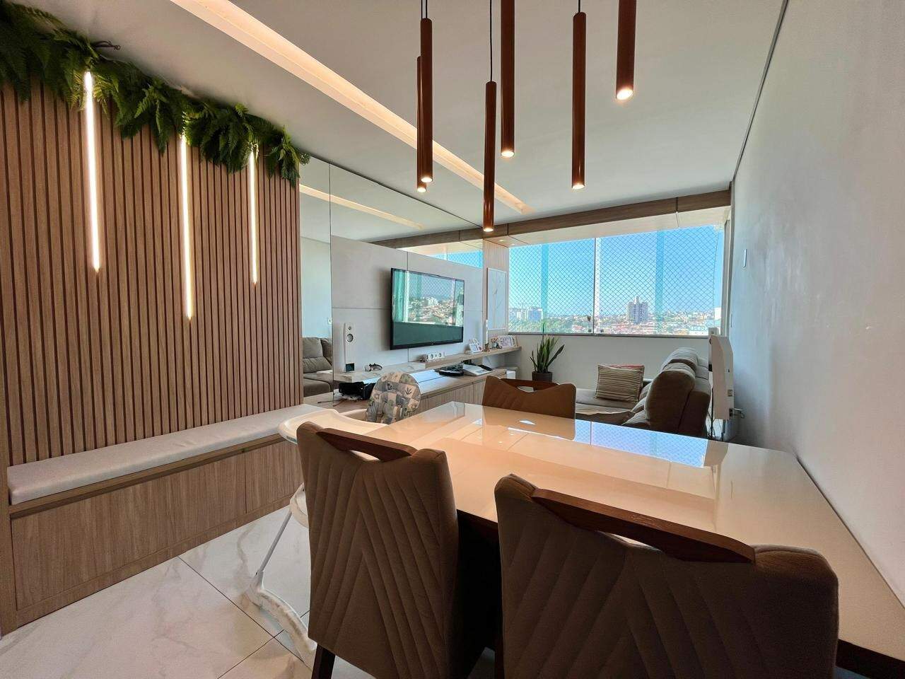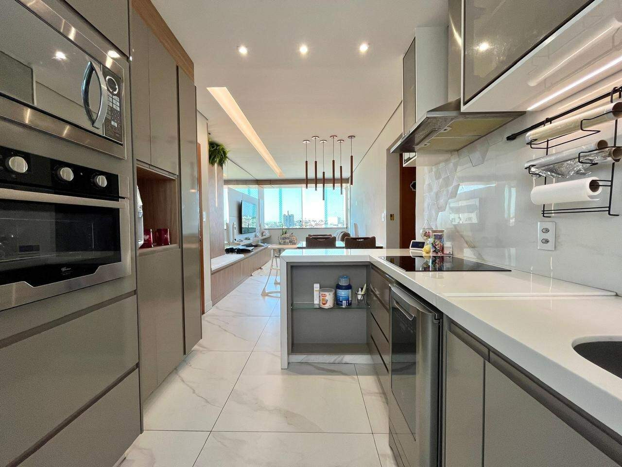 - Ampla sala integrada com a cozinha americana, rebaixamento do teto em gesso e porcelanato ;