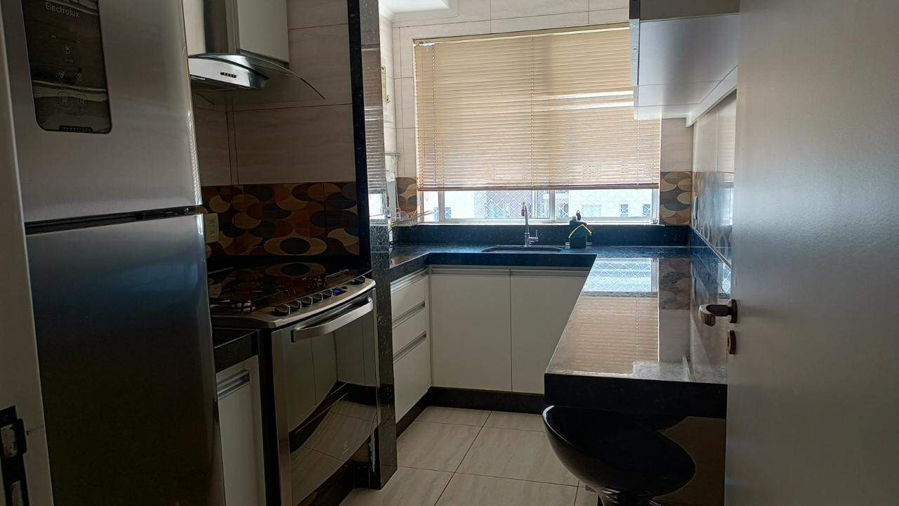 • Cozinha planejada com armários, fogão embutido, coifa e bancadas em granito;